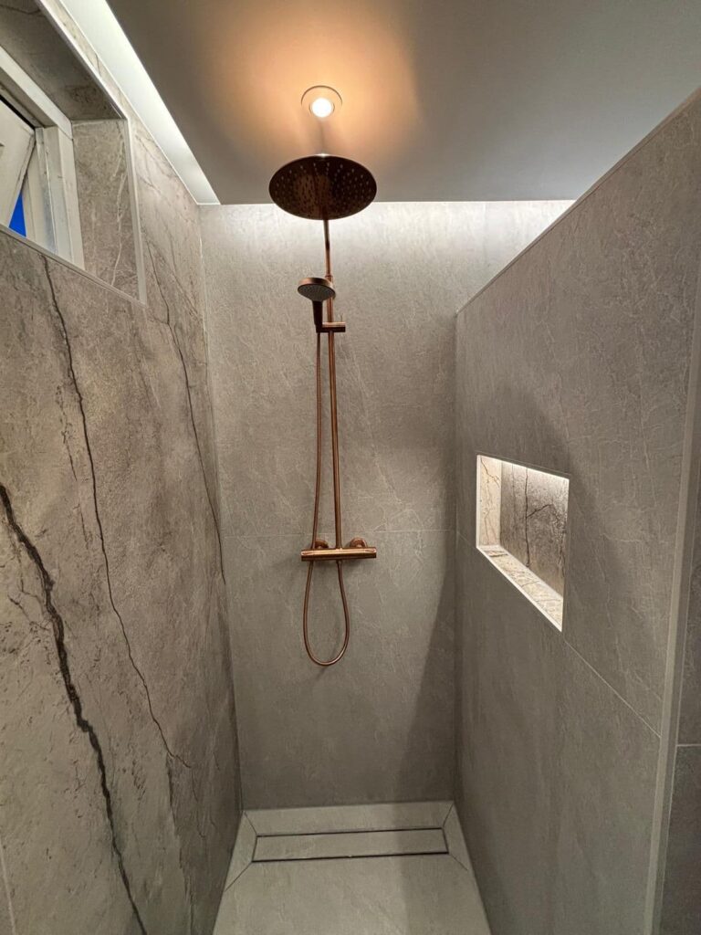 De inloopdouche is strak afgewerkt en voorzien van een nis voor extra gebruiksgemak. Door de slimme indeling blijft de ruimte overzichtelijk en prettig in gebruik. Alles is afgestemd op dagelijks comfort en praktisch gebruik.