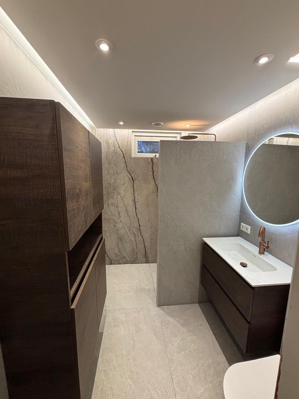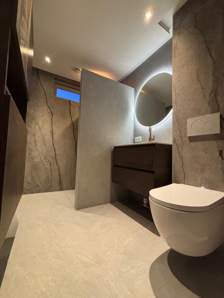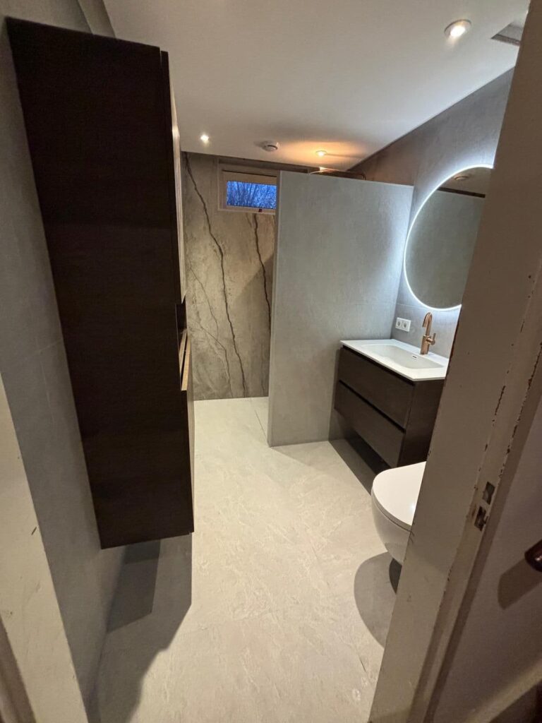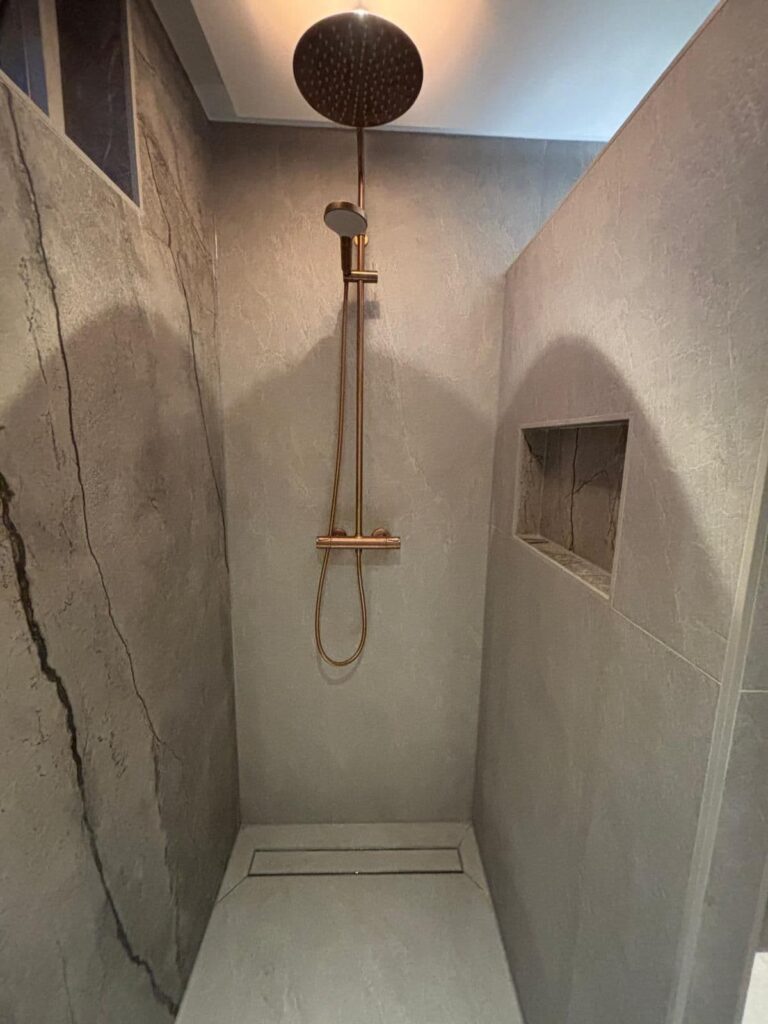 In Voorthuizen hebben we deze high-end badkamer opgeleverd met een praktische indeling en een rustige uitstraling. De wanden zijn afgewerkt met grote slab tegels en op de vloer zijn 120×120 tegels toegepast. Dit zorgt voor een strak geheel met weinig voegen en een onderhoudsvriendelijk resultaat.