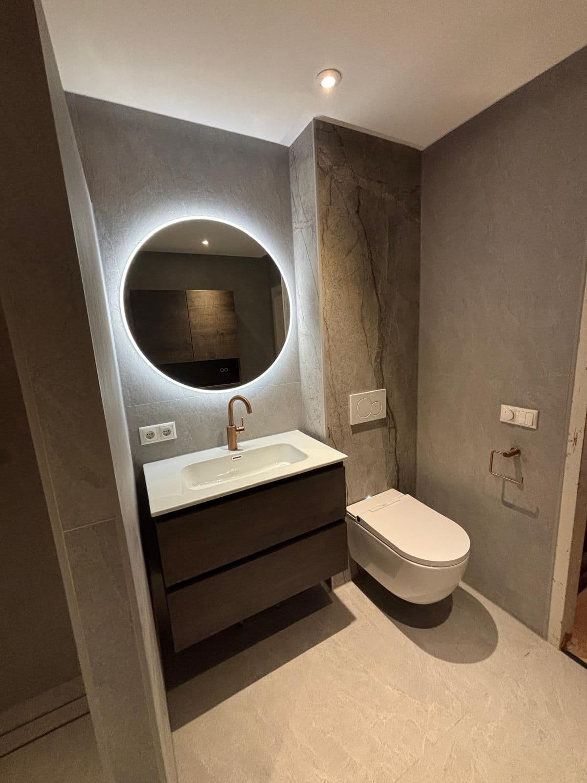 De combinatie van lichte tegels en warme materialen komt terug in het meubel en de bronzen kranen. Deze sluiten goed op elkaar aan en geven de badkamer een verzorgde en strakke uitstraling. De ronde spiegel met verlichting zorgt voor prettig en functioneel licht.