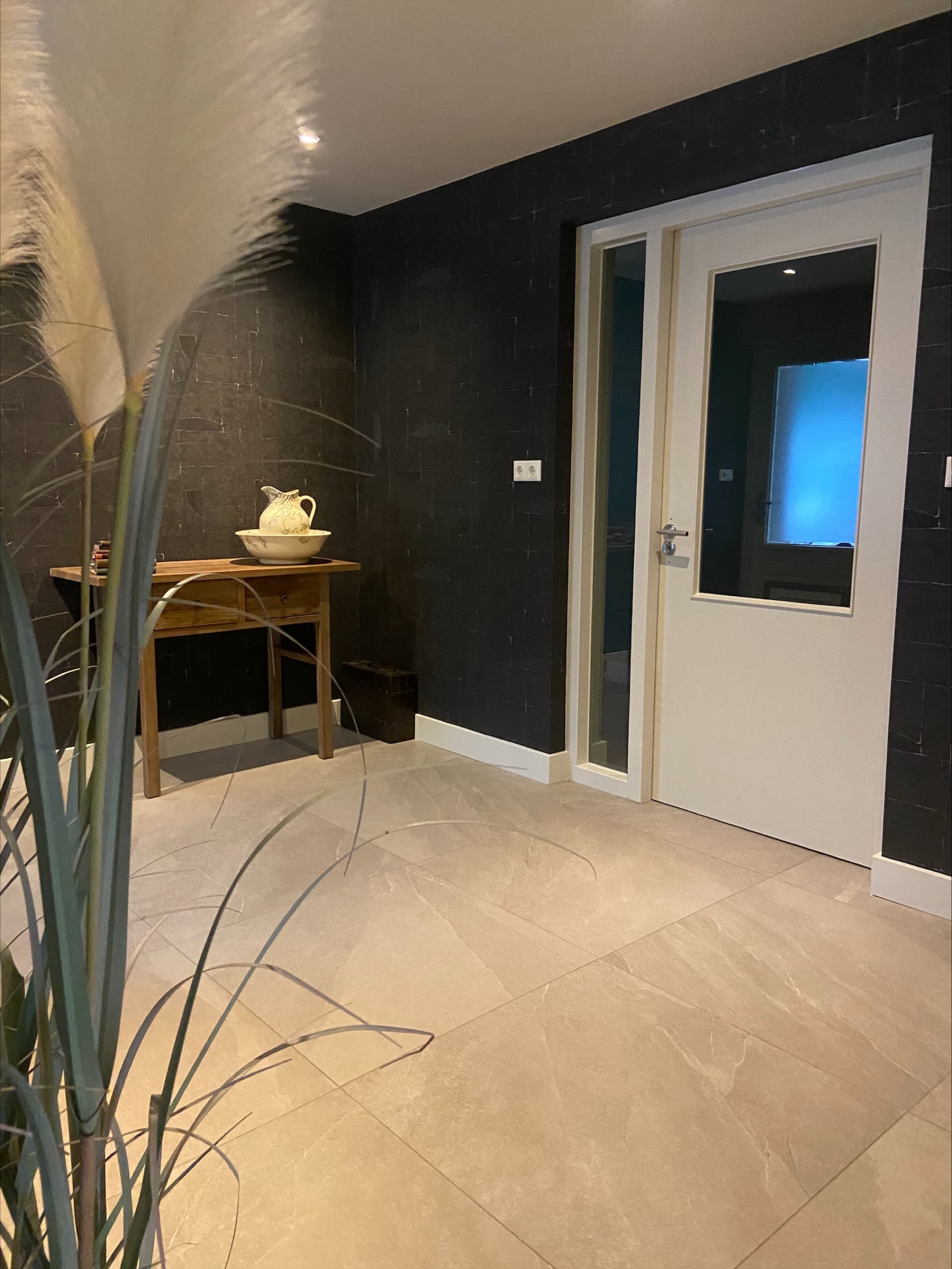 Deze woning in Putten heeft een compleet nieuwe uitstraling gekregen. Op de begane grond hebben we een natuurstenen vloer neergelegd. Deze vloer zorgt voor een rustige, luxe uitstraling in de woning. In het toilet zijn grote tegels gecombineerd met een donkere niswand, wat zorgt voor extra diepte. De houten wastafel met waskom zorgt voor warmte in de ruimte en geeft contrast tussen de materialen. Het resultaat is een nette afwerking die mooi past bij de vloer in de woning.